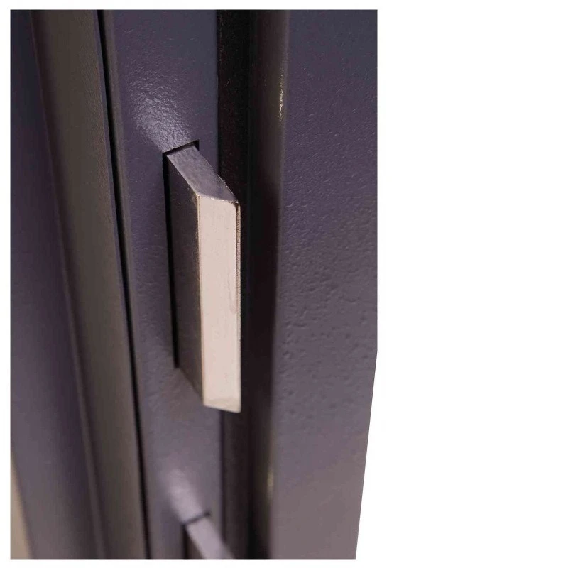 - Сейф HS2051E оборудуется четырёхсторонним ригельным механизмом, представленным четырьмя прямоугольными стальными ригелями 100×10 мм – выдвигающимися с трёх сторон, а также пассивными (неподвижными) со стороны петель.