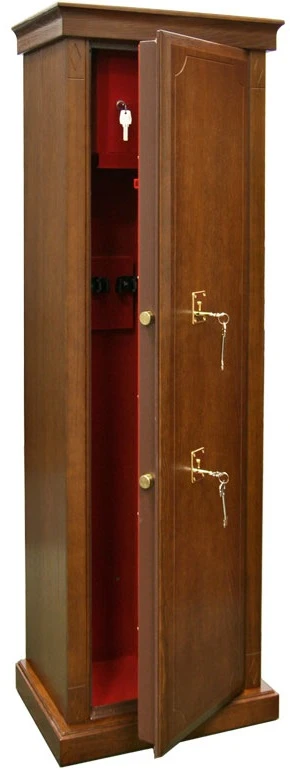 — Внутренняя отделка – эффектный красный бархат, успешно оберегающий оружие от царапин. Снаружи – декоративная отделка натуральным деревом и шпоном дуба.