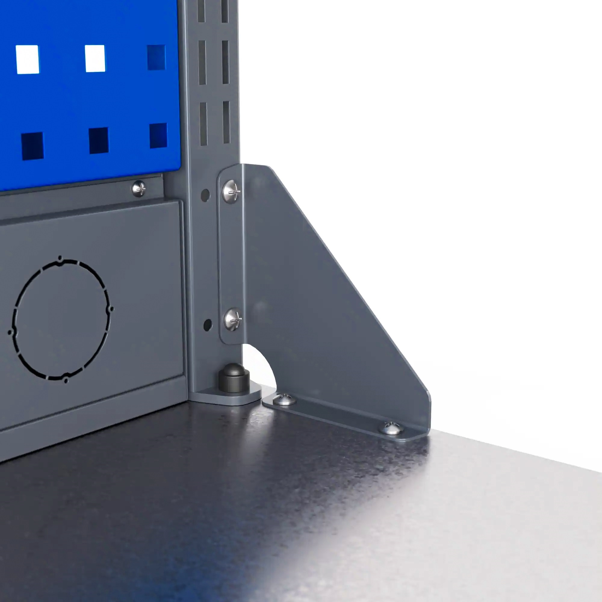 - Ключевые элементы и опоры производятся из листового металла (от 0.6 до 1.5 мм), гарантируя стойкость и надёжность верстака в течение долгих лет службы.